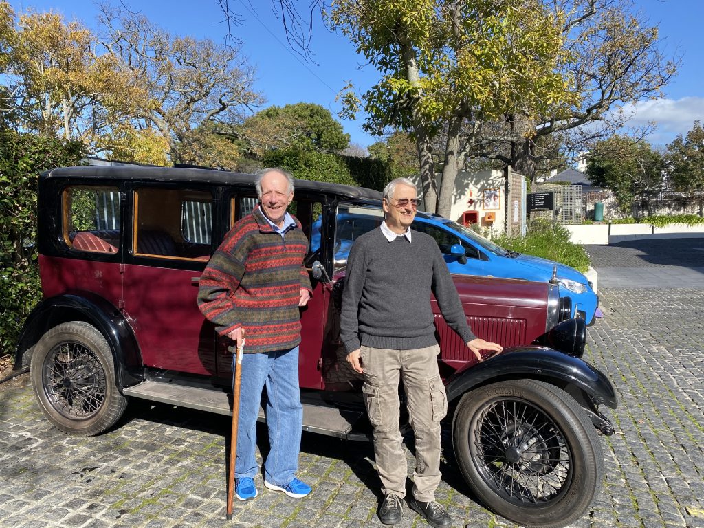 Peter Chubb (left) and Victor Szechenyi with Mugwump, 60 years after Mugwump completed the return journey. Taken at the Vineyard Hotel, June 2024